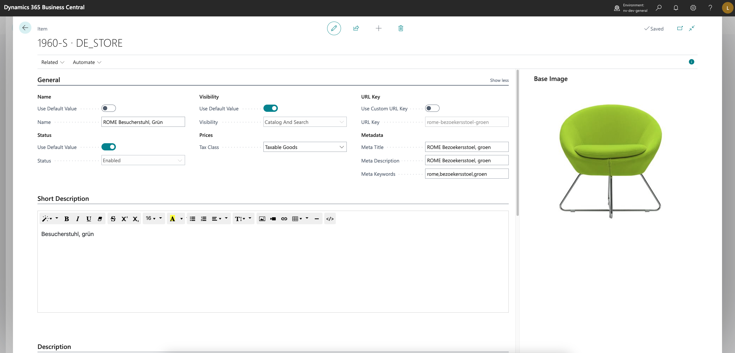 This will provide you with the option to use translations for the name, short description, long description, meta data and URL key. By default the store specific item card uses the values of the name, status and visibility from the main item card. These can be overruled on the store specific item card.