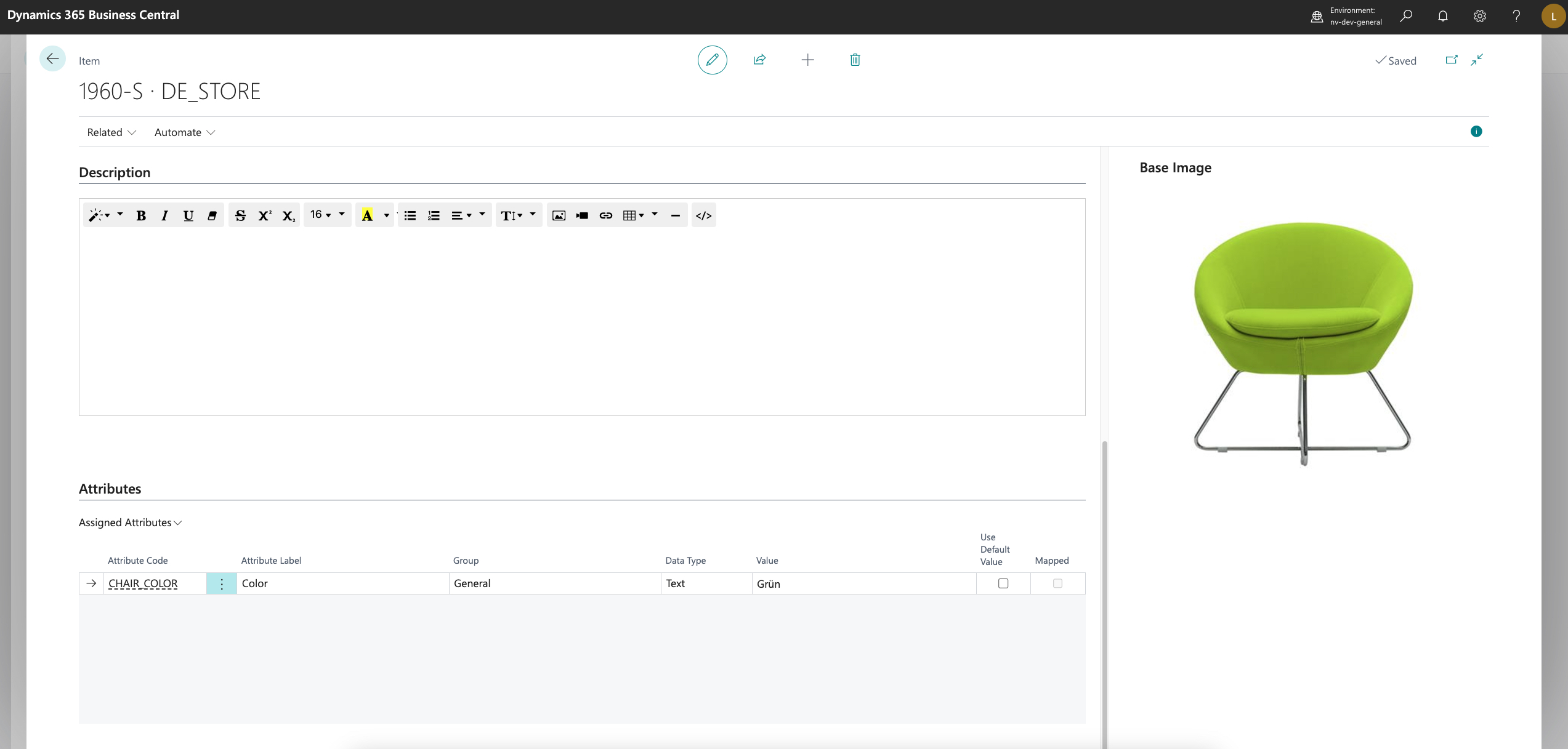 Depending on the Attribute Set Code you have selected at the top of the item card, you will see all the attributes that belong to that set listed under Attributes. In this section you can set all attribute values. Values for Mapped Attributes cannot be set manually. Those values are managed by the mapping mechanism.
